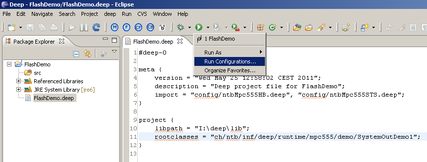 Create a new run configuration by marking the project file HelloWorld.deep. Then, right-click on it and choose Run As → Deep Application.