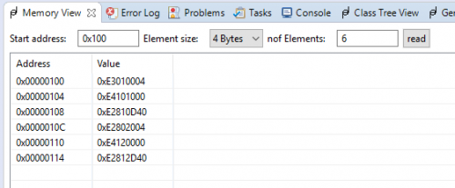 This view displays memory blocks. You can choose the start address, the element size and the number of elements to read.